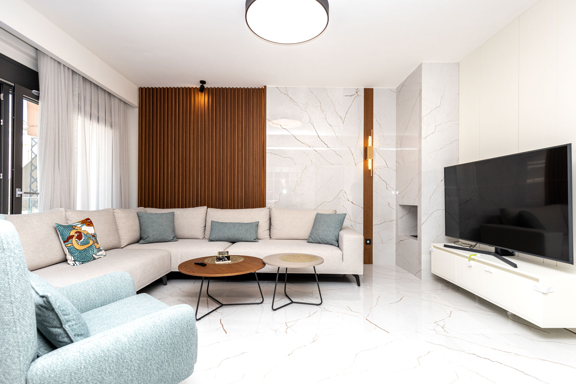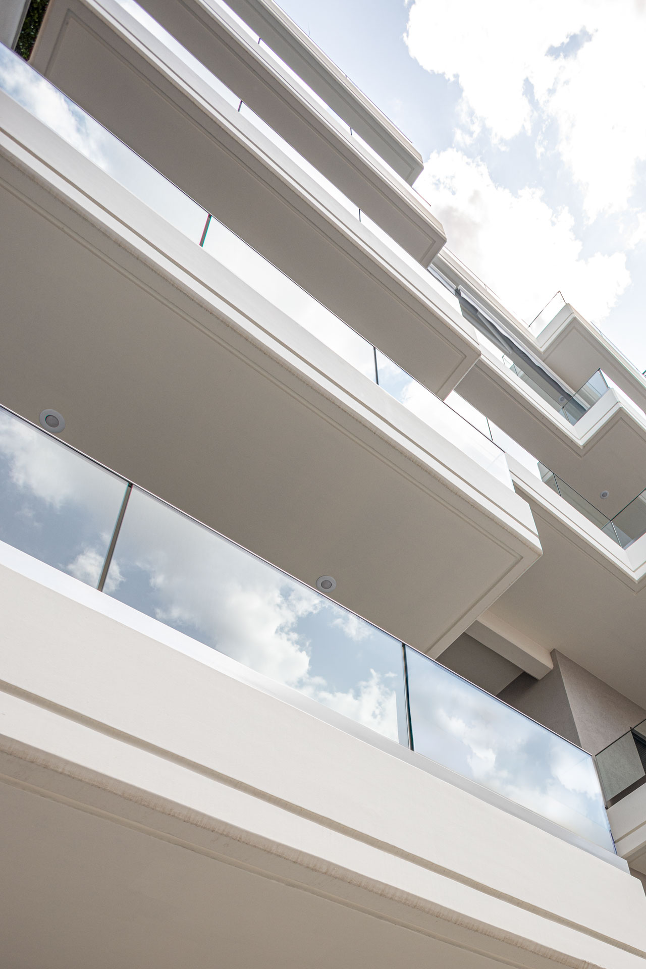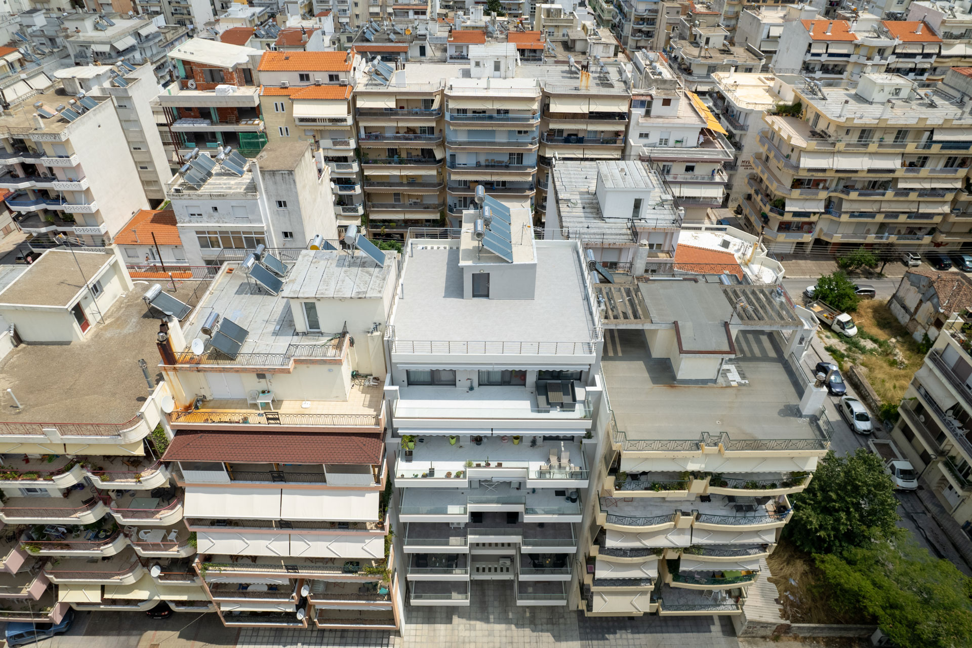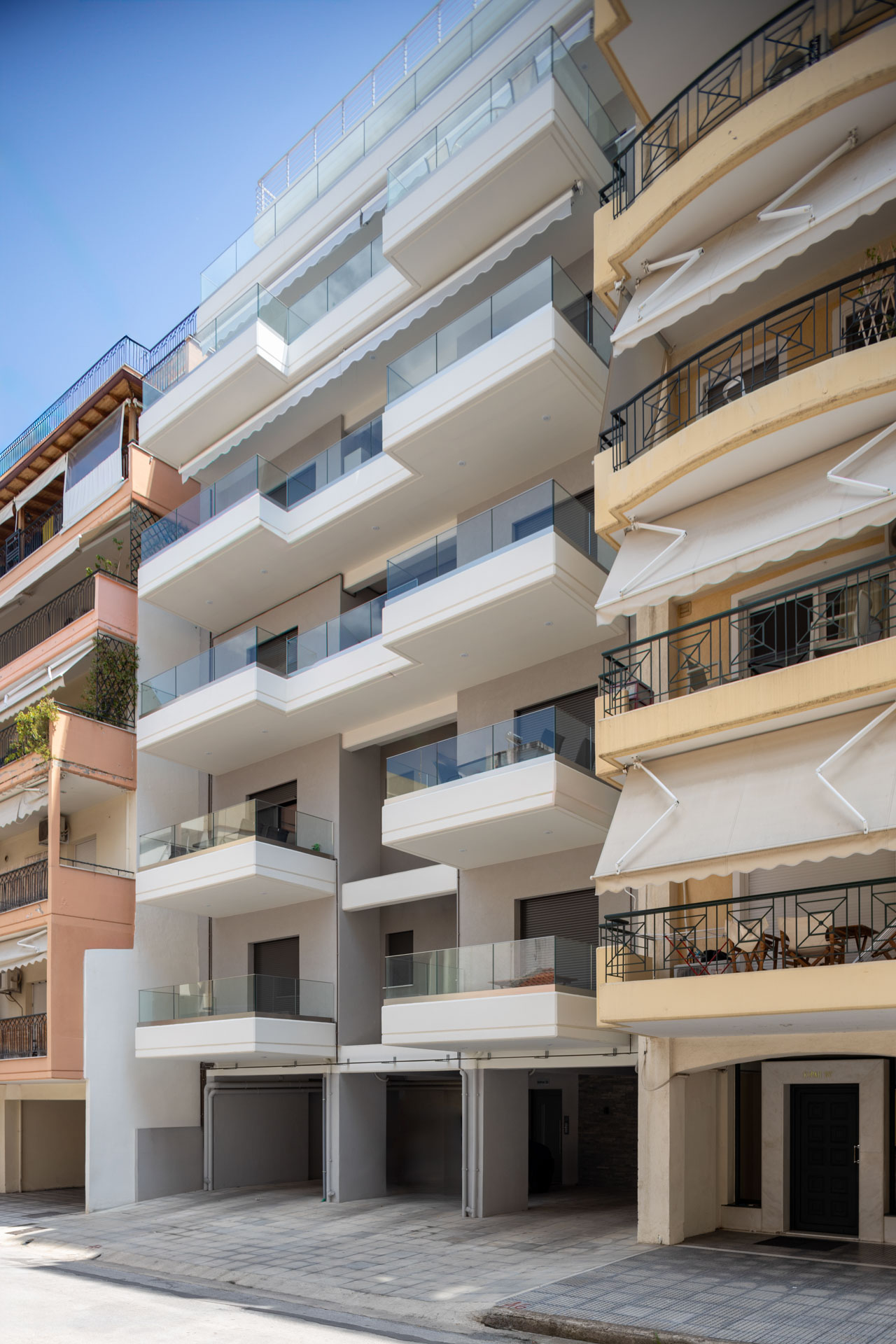 The six-story building consists of 7 contemporary apartments and a 5th-6th floor maisonette with an area of 205 m². The apartment sizes range from 65 square meters to 129 square meters, carefully considering every detail and maximizing the use of every square meter. The apartments are flooded with natural light, creating a welcoming and calm atmosphere, and are thoughtfully designed to provide maximum comfort to their owners.