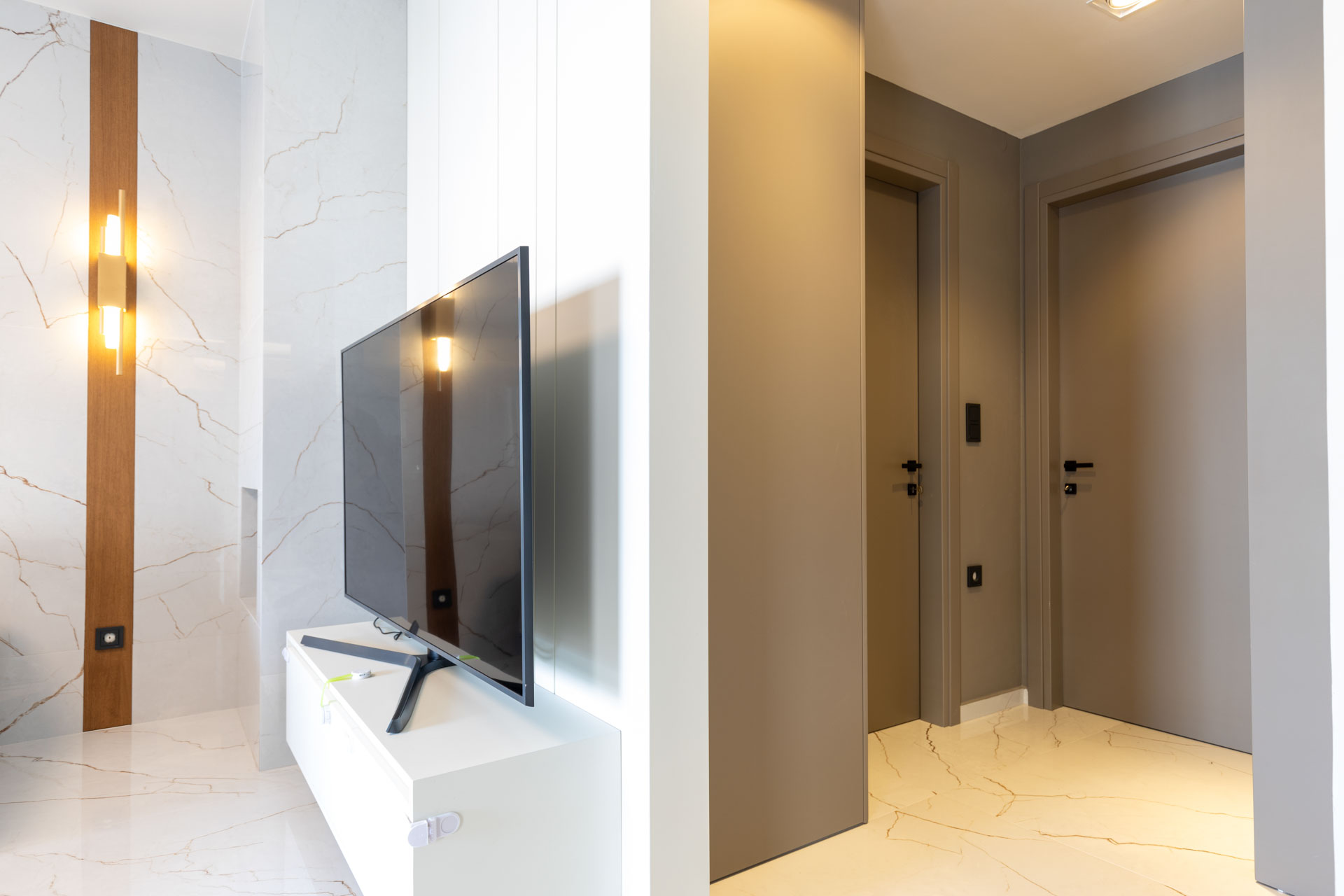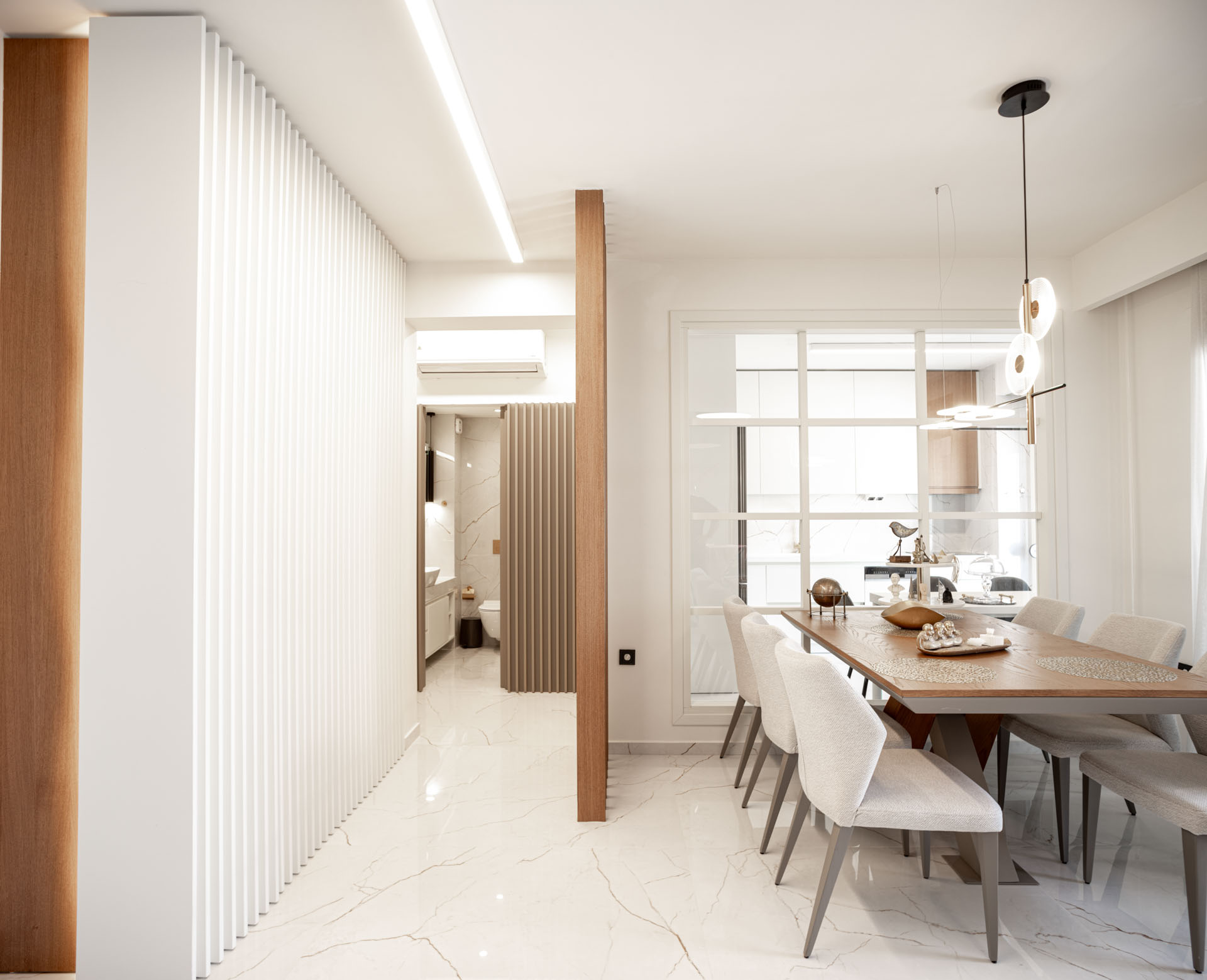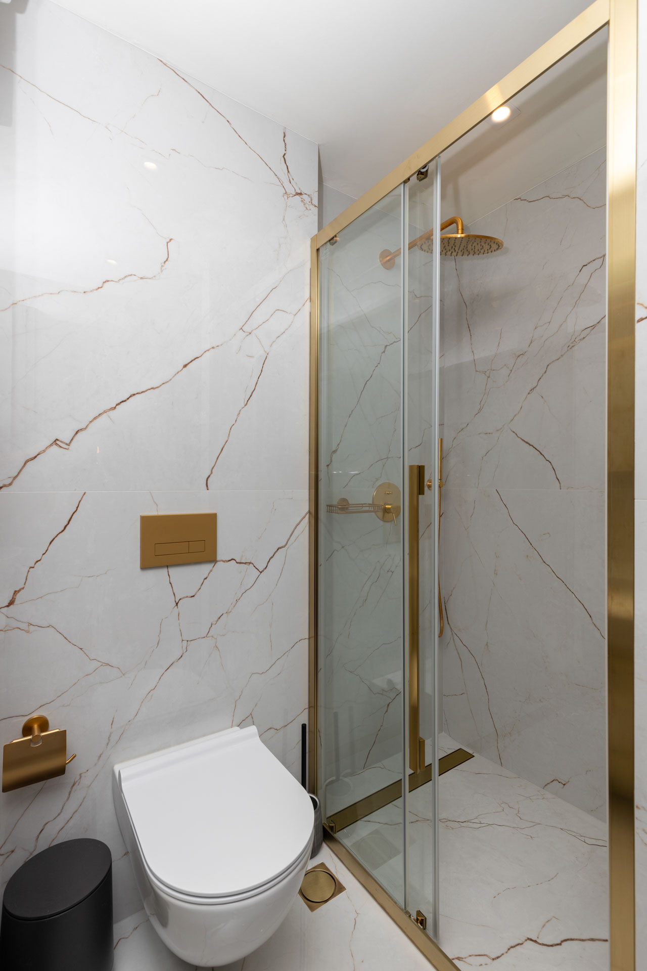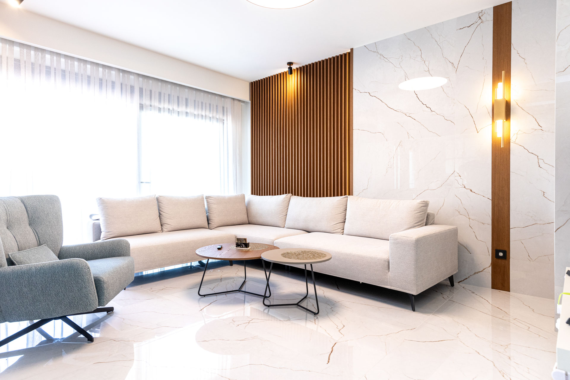 The six-story building consists of 7 contemporary apartments and a 5th-6th floor maisonette with an area of 205 m². The apartment sizes range from 65 square meters to 129 square meters, carefully considering every detail and maximizing the use of every square meter. The apartments are flooded with natural light, creating a welcoming and calm atmosphere, and are thoughtfully designed to provide maximum comfort to their owners.