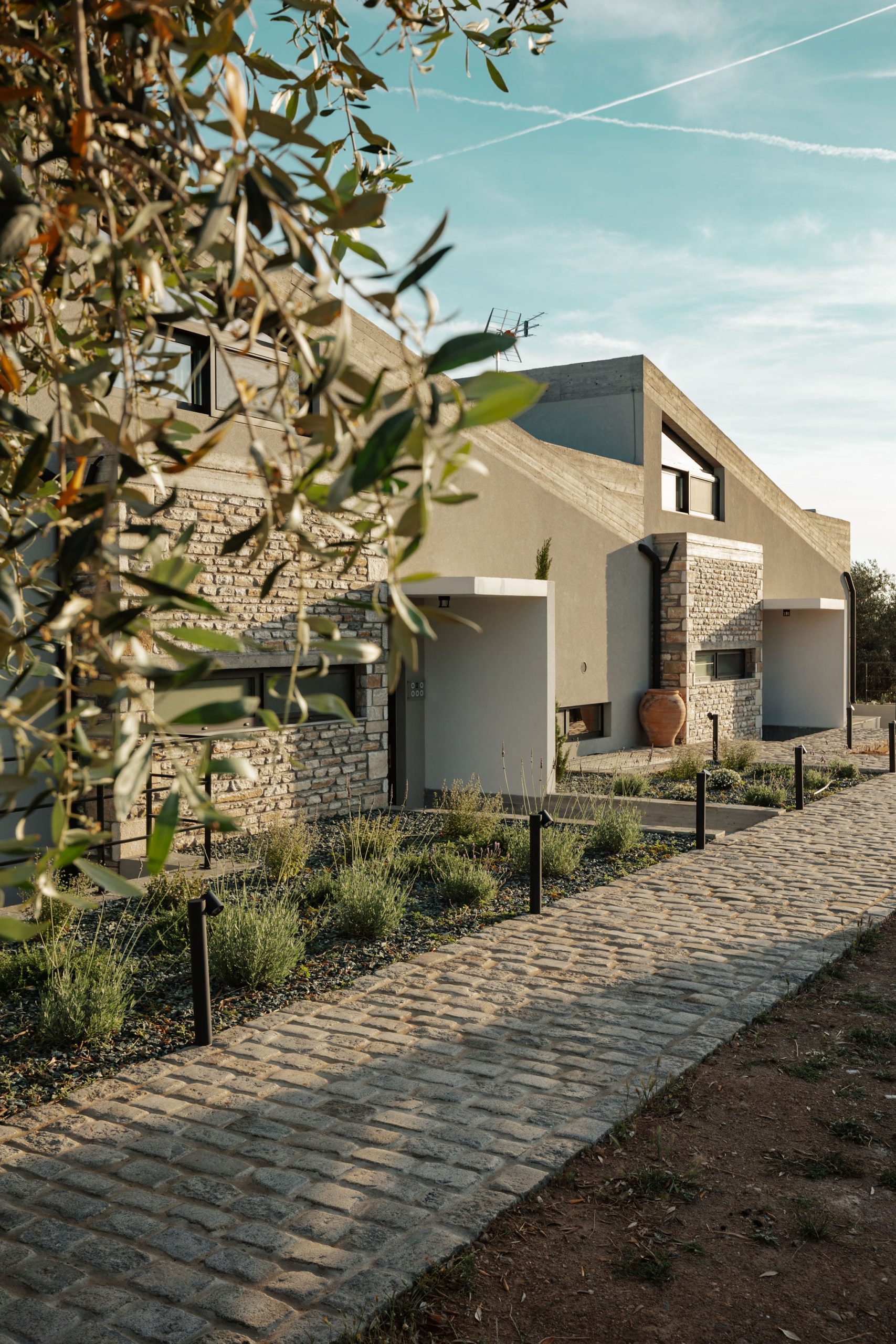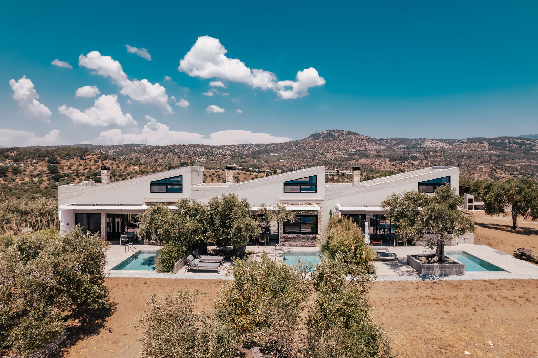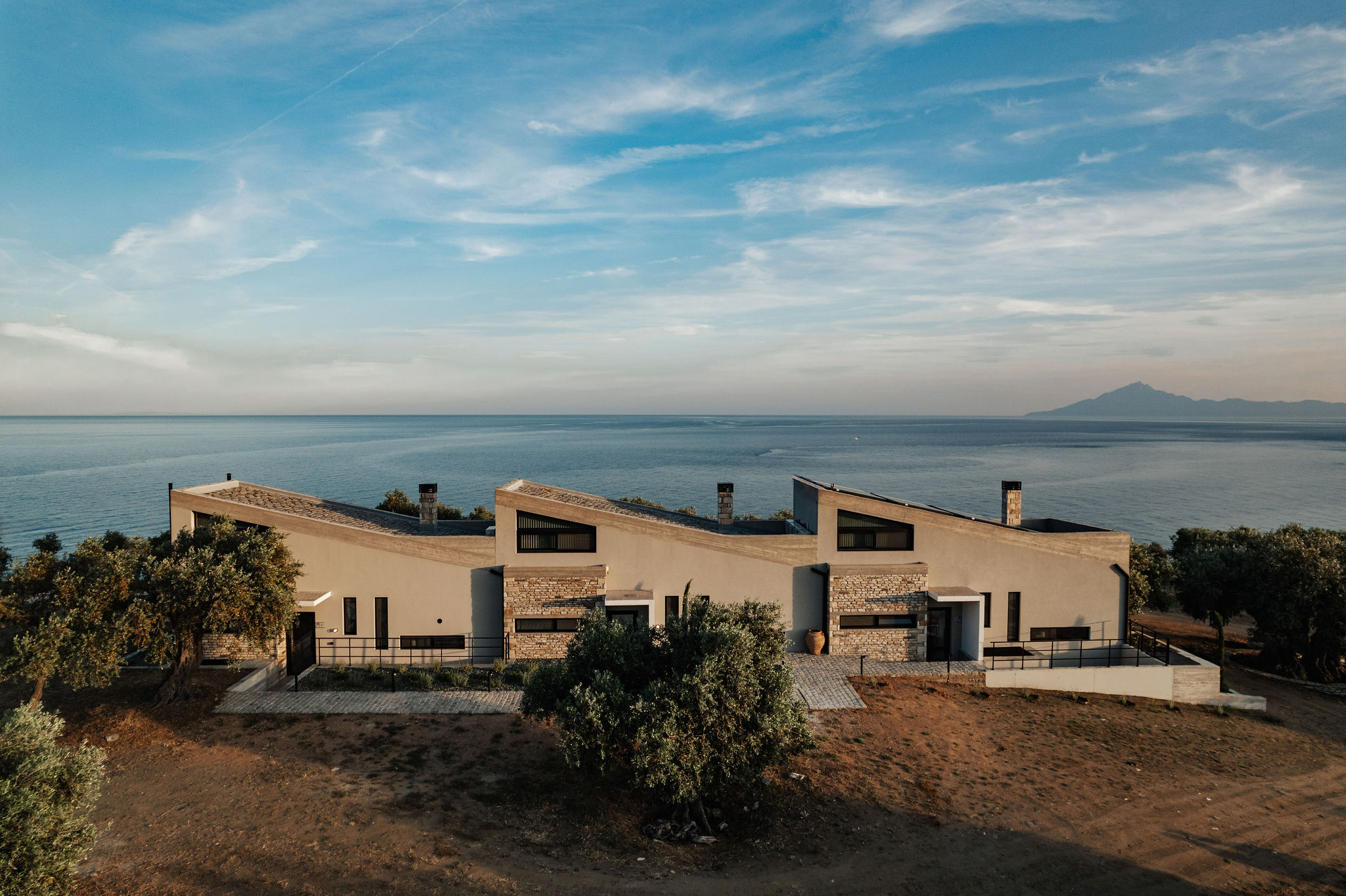 These words by A. Konstantinidis served as the starting point for the compositional exploration of this residential complex designed for tourism use. For architect Maria Panagiotarou, the almost painstaking search for a composition arising from the ground itself was the foundation of the design. While the primary aim was to meet functional needs, a central objective was also to elevate the project to harmonize with the distinctive relief of the olive grove landscape in Astris, Thassos.