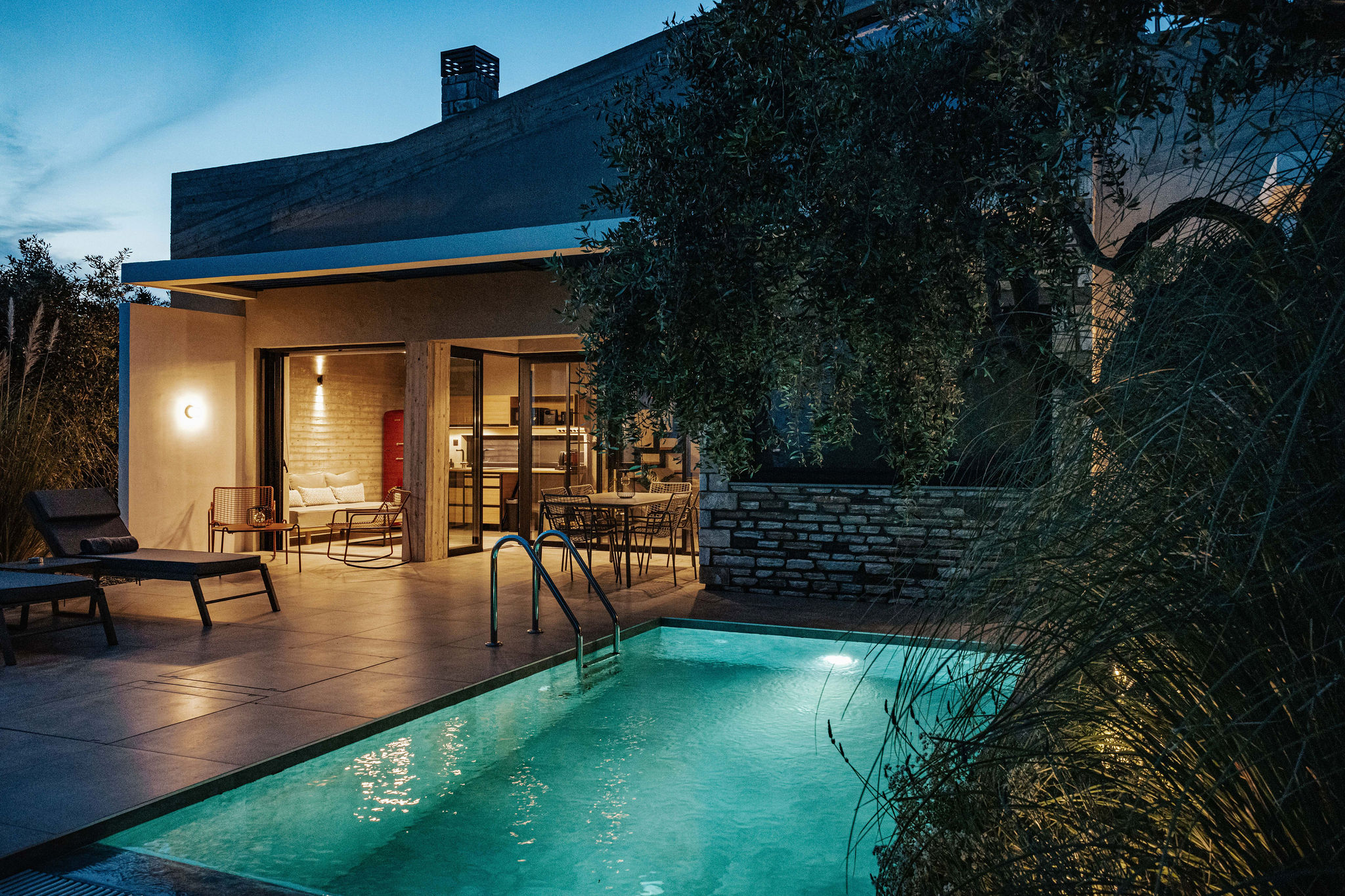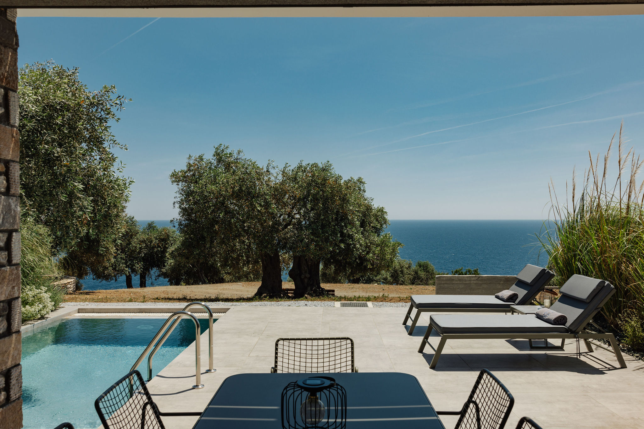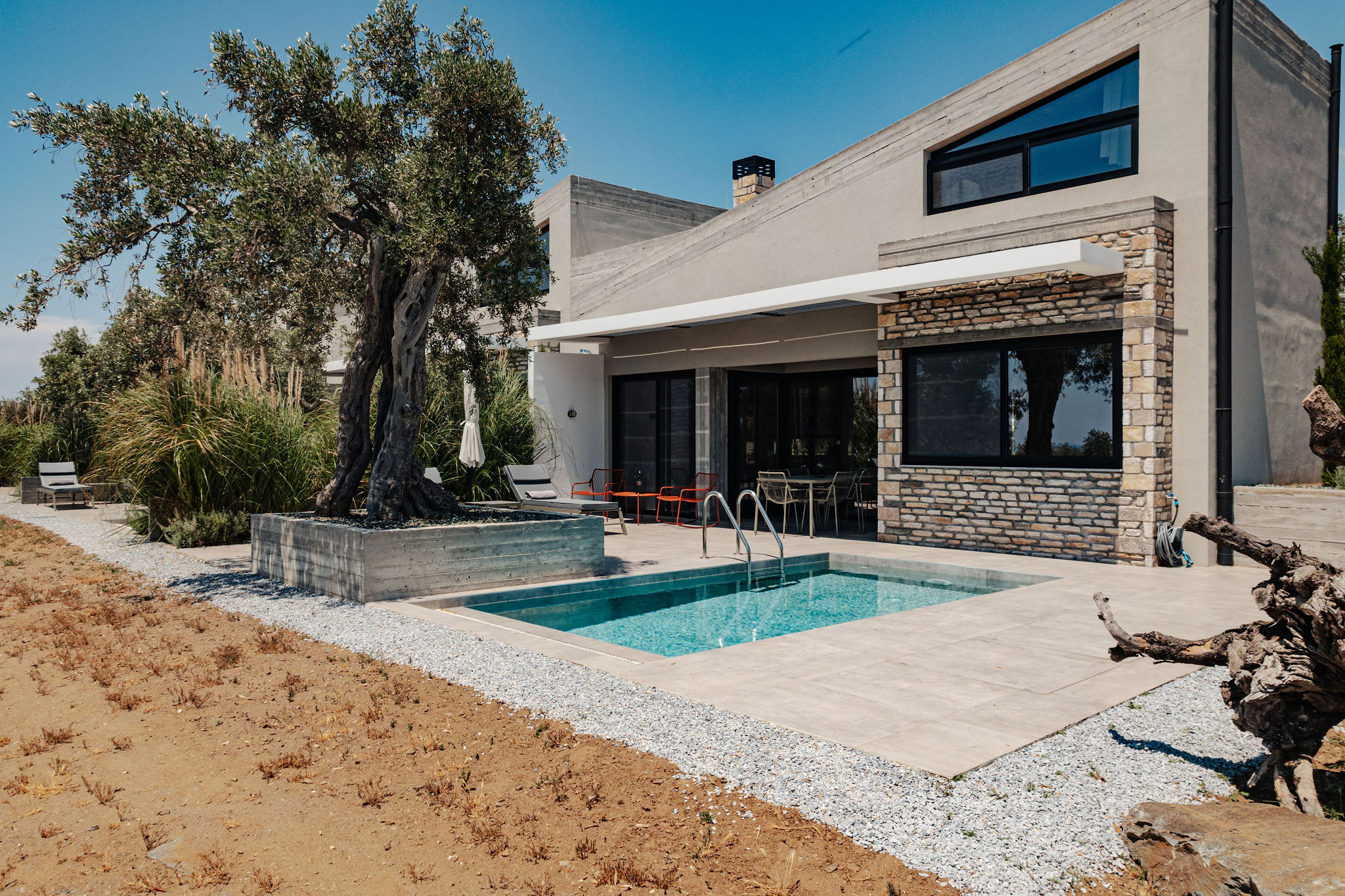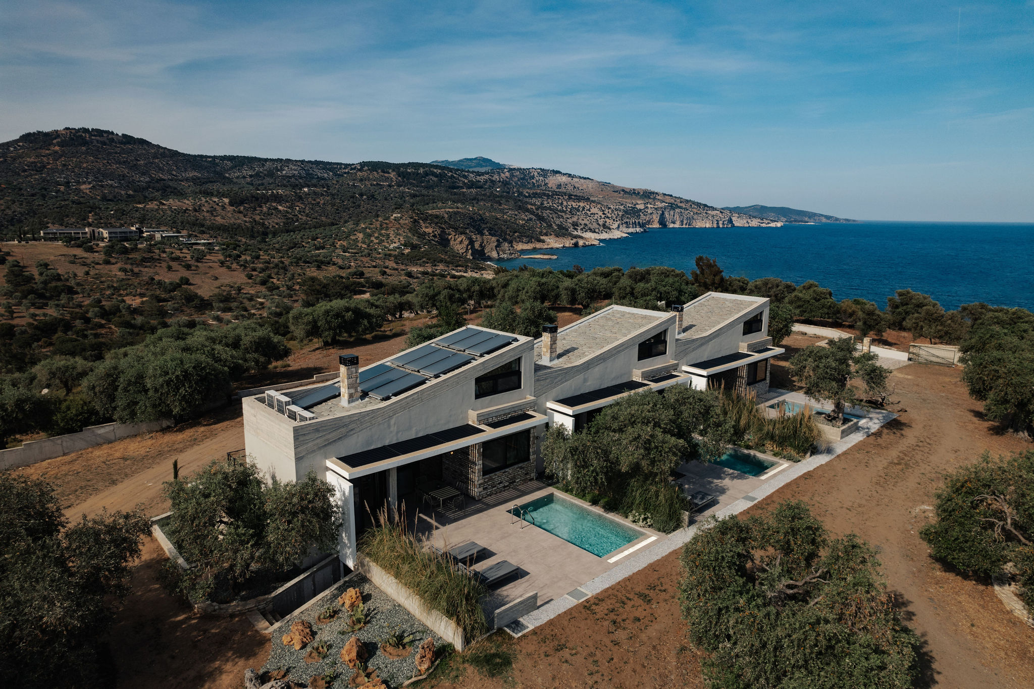 These words by A. Konstantinidis served as the starting point for the compositional exploration of this residential complex designed for tourism use. For architect Maria Panagiotarou, the almost painstaking search for a composition arising from the ground itself was the foundation of the design. While the primary aim was to meet functional needs, a central objective was also to elevate the project to harmonize with the distinctive relief of the olive grove landscape in Astris, Thassos.