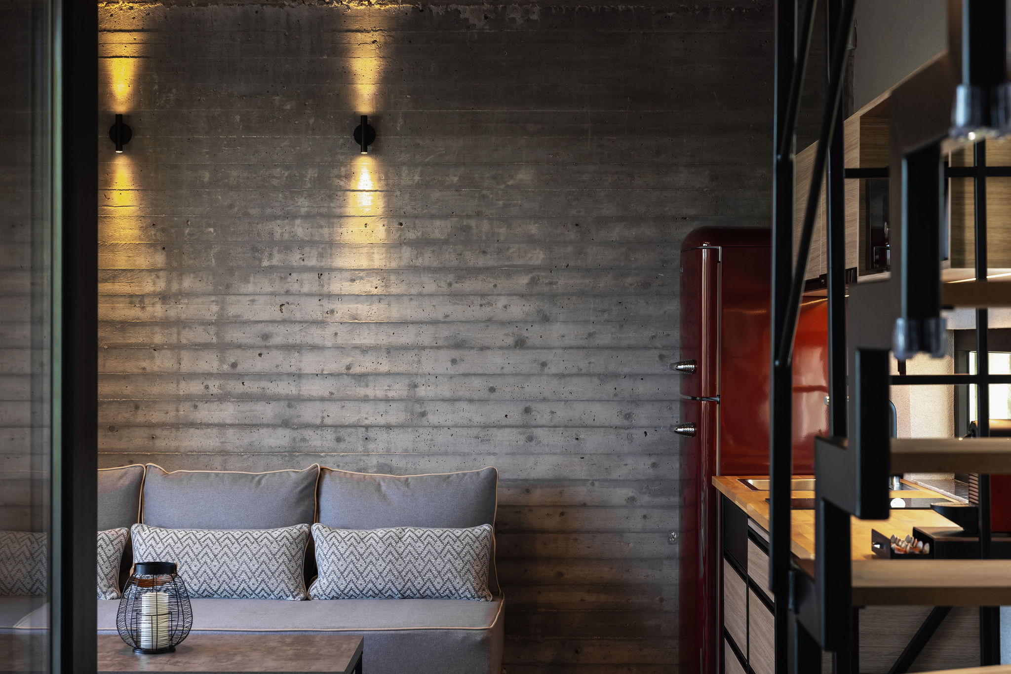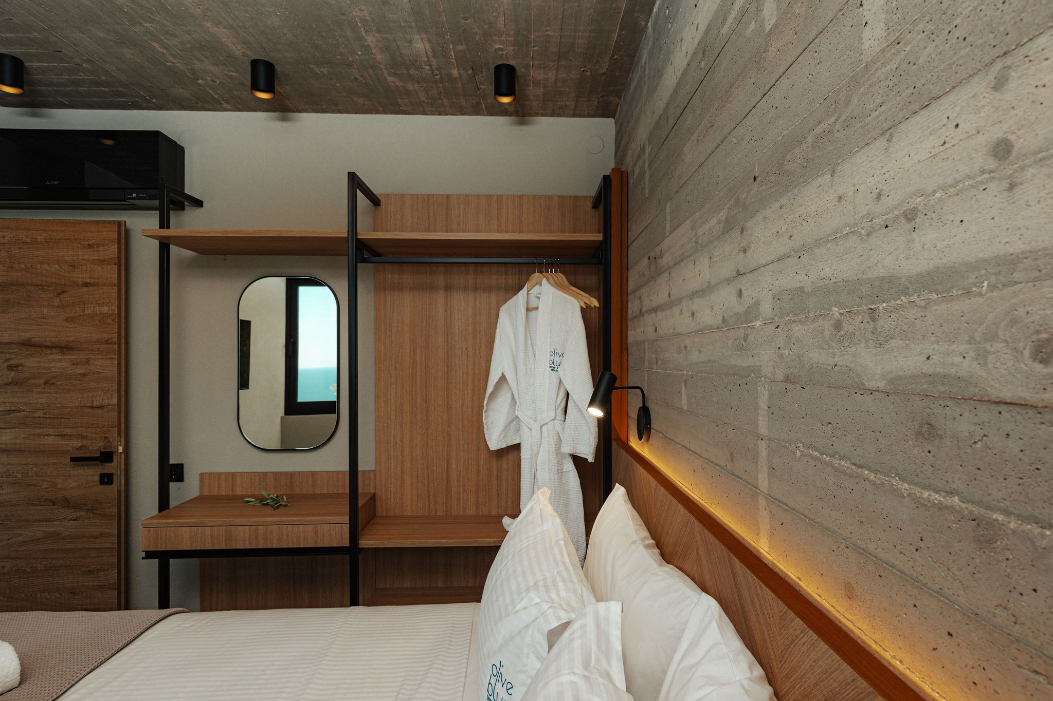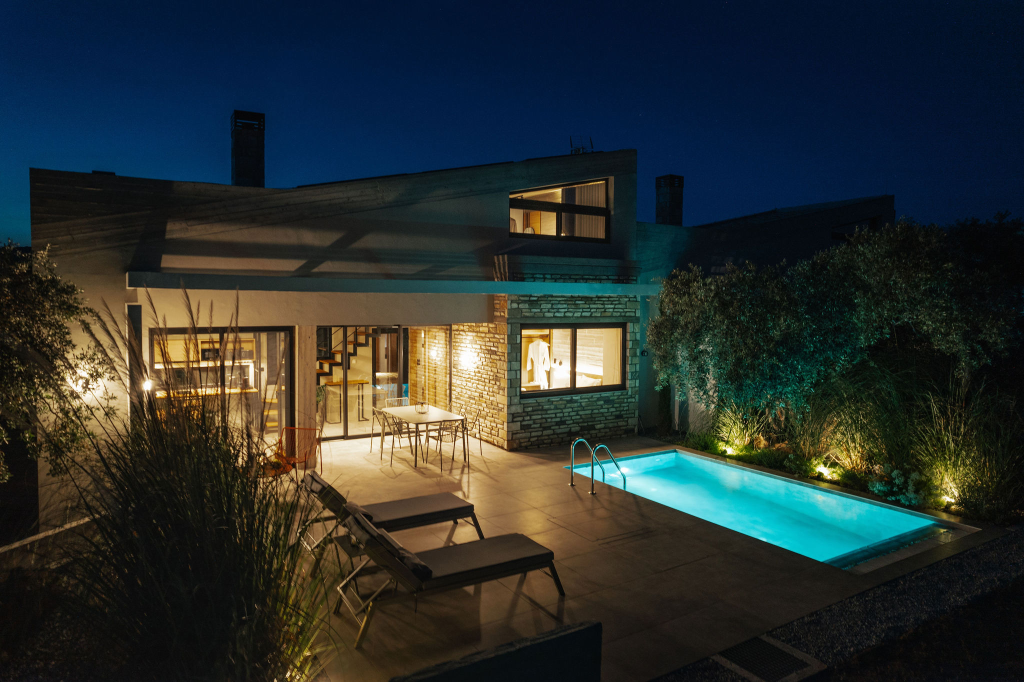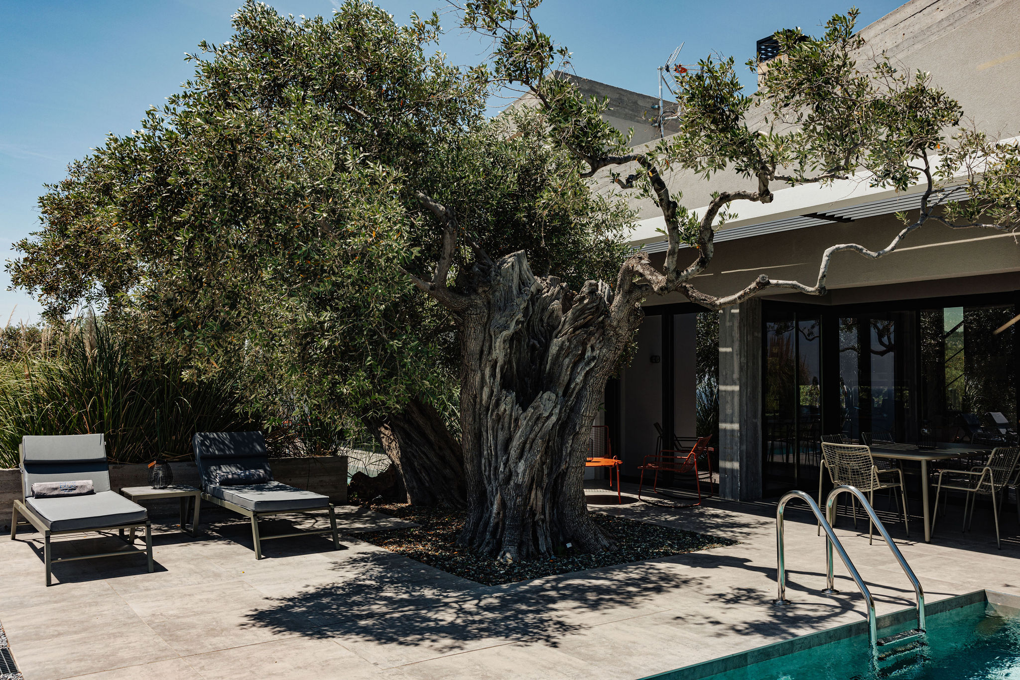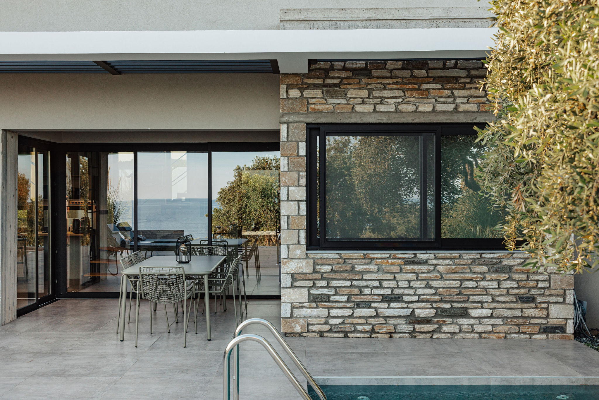 Finally, it is worth noting that the aim of the composition was to adopt and relate the landscape features and the forces of the land (materials, textures, views). The exposed concrete, local stone, and plaster, combined with the colors and elements of the olive grove, as well as the interplay of light and shadow, shape the character of the area.