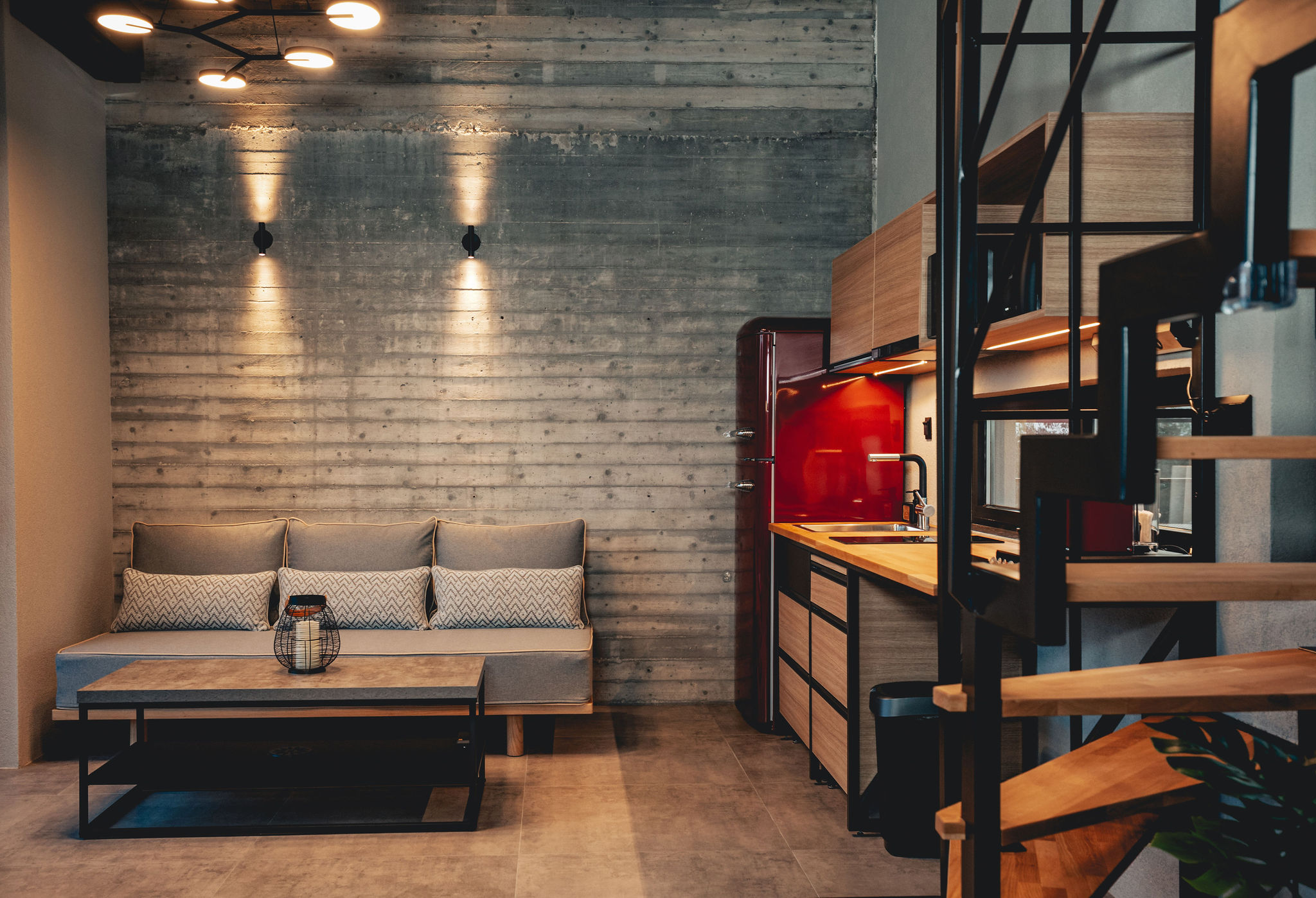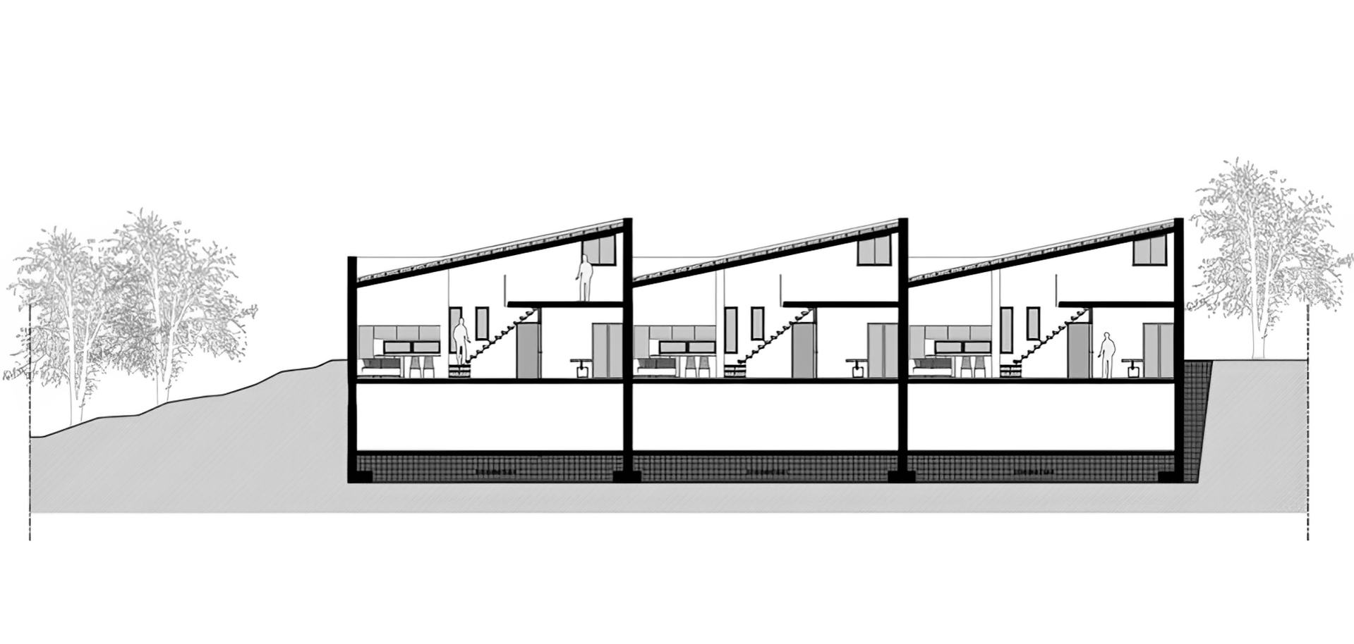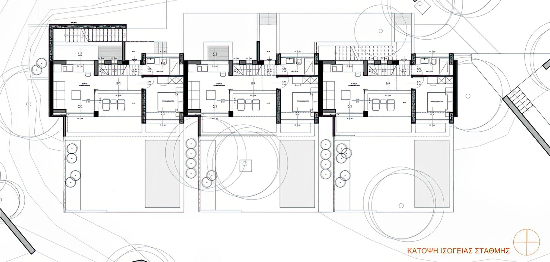 It consists of the ground floor and the attic level. On the ground floor, the living and sleeping areas are developed, while at the heart of each unit, a semi-outdoor space is created, forming a “summer” room that is open yet protected. The open southern facade, with its successive window frames, the creation of the semi-outdoor space, and the canopy extending from it, as well as the use of the same level, material, and floor height, unify the “inside” with the “outside.” This design dissolves the boundaries and extends life into the semi-outdoor and outdoor spaces.