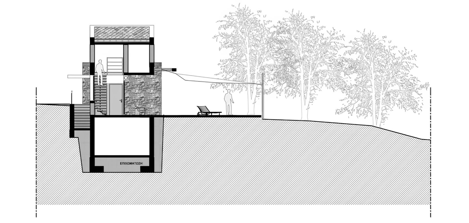 The linear development, parallel to the east-west axis, faces south towards the view of the sea, while functioning as a single stroke across the rocky landscape with the olive trees. This punctual intervention is essentially anchored to the natural ground with minimal alteration, leaving the land and the olive trees as untouched as possible.
